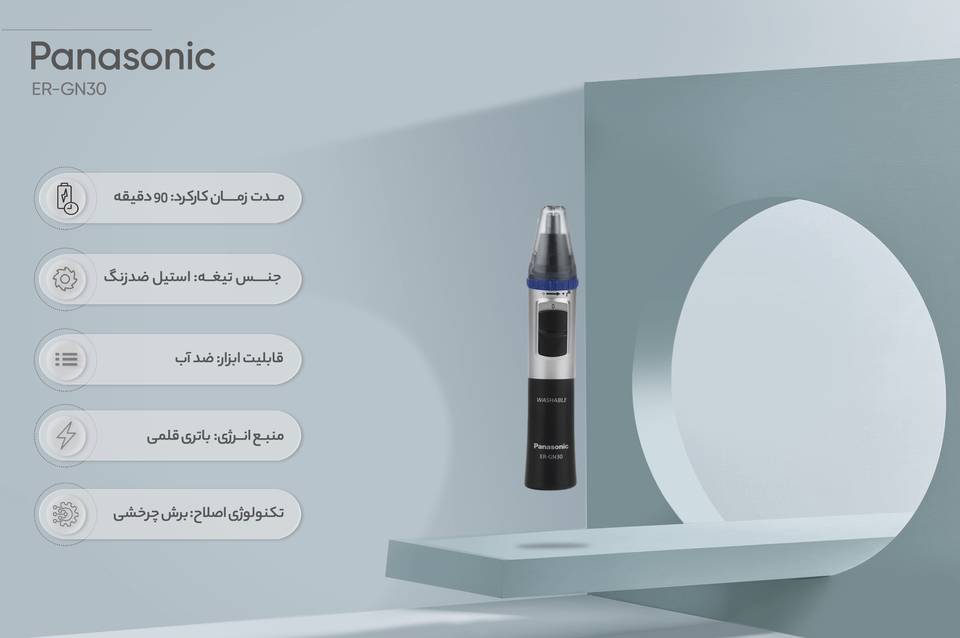 موزن گوش و بینی «پاناسونیک» (Panasonic) مدل «ER-GN30» دارای تیغهی دوطرفه و سیستم شستوشوی گردابی است. تیغهی داخل موزن به شکل دوطرفه طراحی شده است. این تیغه دو لبه در کنارهها و دو لبه در بالا دارد؛ به این ترتیب هنگامیکه موها از کنارهها یا از بالا وارد سر موزن میشوند، توسط یکی از تیغهها به دام میافتند.